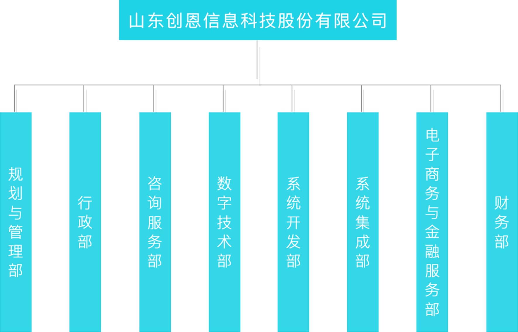 山东创恩信息科技股份有限公司设规划与管理部、行政部、咨询服务部、数字技术部、系统开发部、系统集成部、电子商务与金融服务部、财务部8个部门。